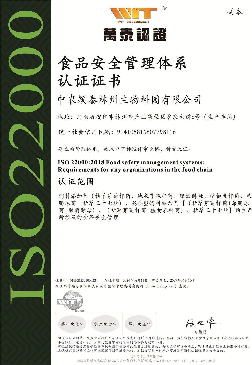 食品安全管理體系認證證書